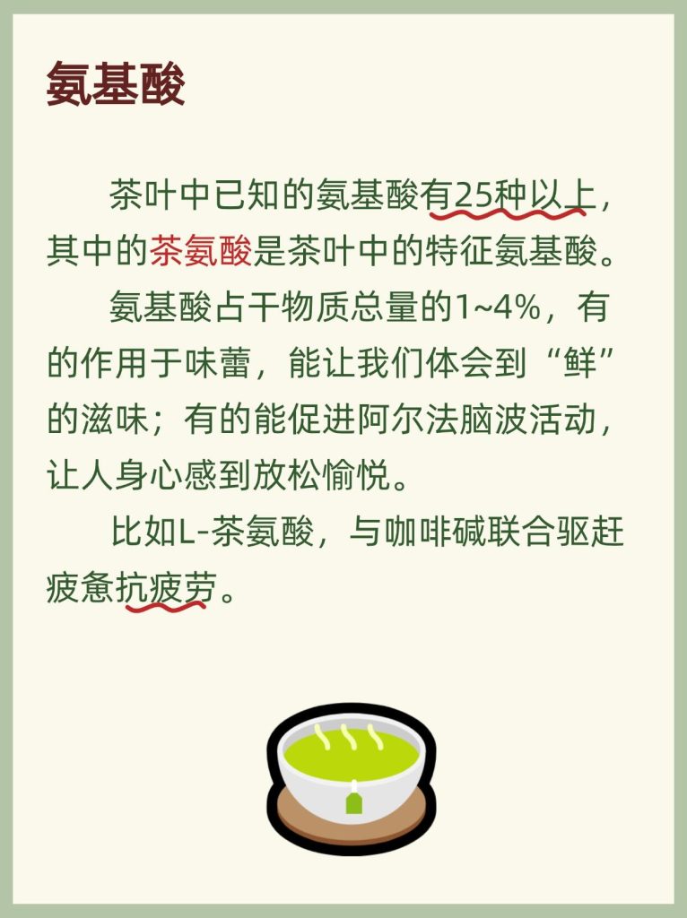 Amino acids: There are more than 25 known amino acids in tea, among which theanine is the characteristic amino acid in tea, which can promote alpha brain wave activity and make people feel relaxed and happy.