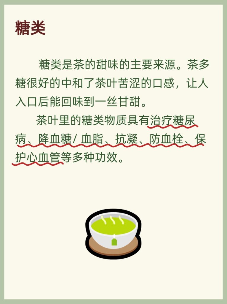 Sugar: the main source of the sweetness of tea, which has many effects such as treating diabetes, lowering blood sugar and blood fat, anticoagulation, anti-thrombosis, and protecting the cardiovascular system.